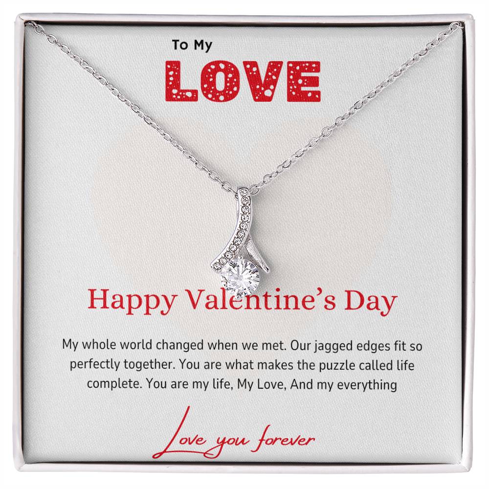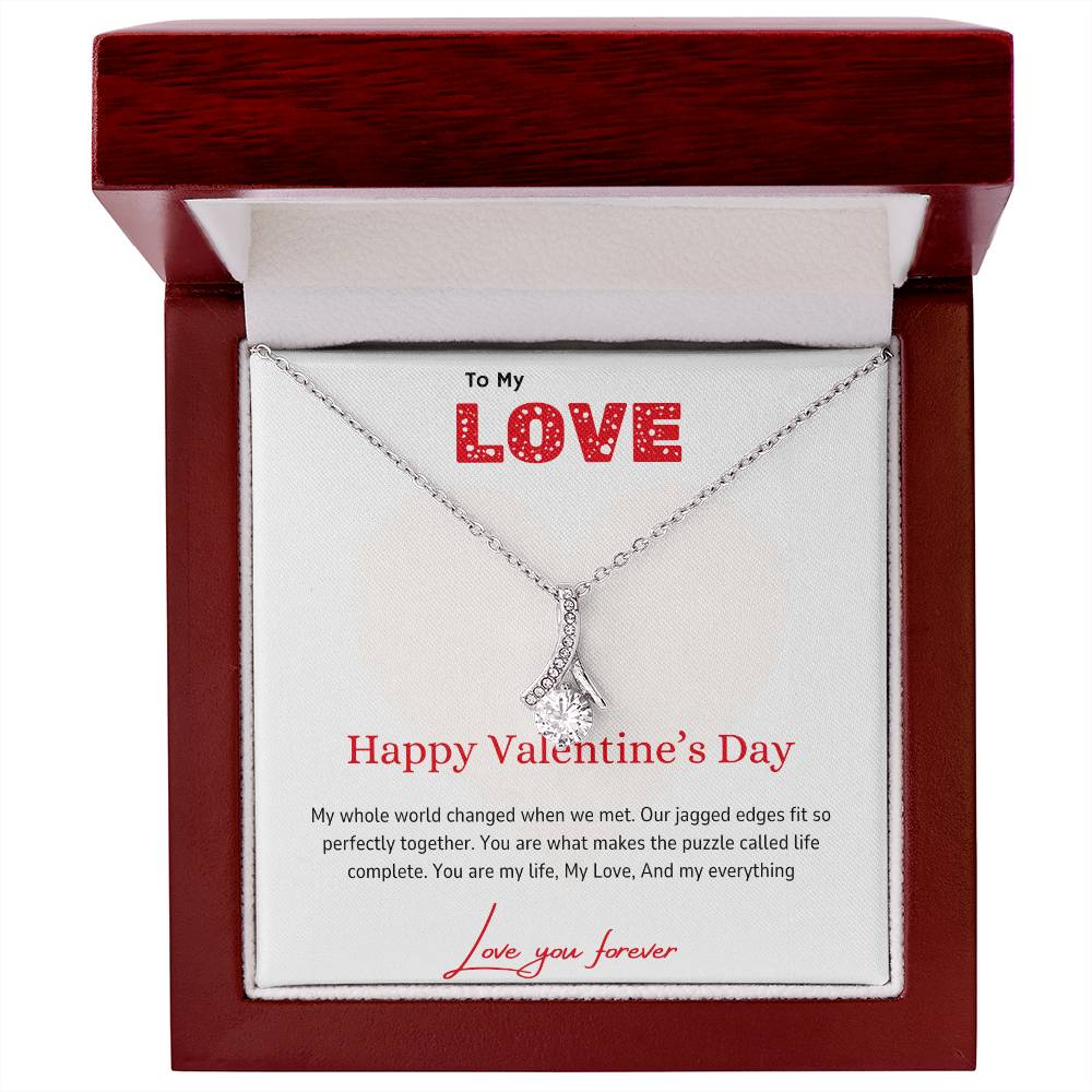 TO MY LOVE, HAPPY VALETINE'S DAY. MY WHOLE WORLD CHANGED WHEN WE MET. OUR JAGGED EDGES FIT SO PERFECTLY TOGETHER. YOU ARE WHAT IT MAKES THE PUZZLE CALLED LIFE COMPLETE. YOU ARE MY LIFE, MY LOVE, AND MY EVERYTHING. LOVE YOU FOREVER.